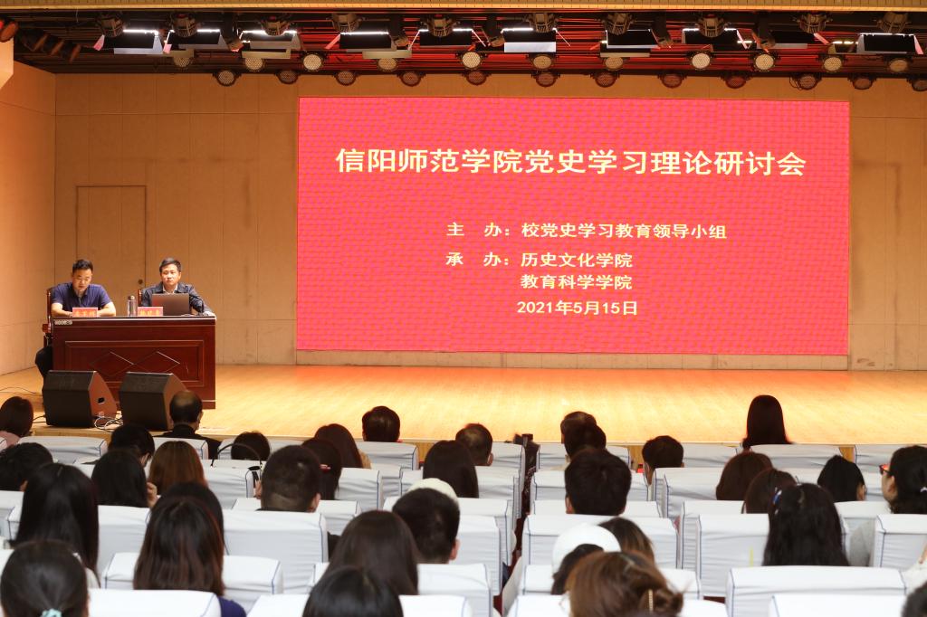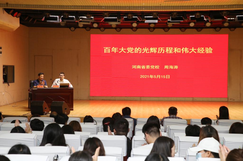为推进党史学习教育深入开展,5月15日,校党史学习教育领导小组举行了为期1天的理论研讨会。研讨会由历史文化学院和教育科学学院承办。5月15日上午,在理科楼报告厅举行两场党史学习报告会,中央党校(国家行政学院)韩晓青博士作了题为《党对中国革命道路的探索》、河南省委党校周海涛博士作了题为《百年大党光辉历程和伟大经验》的党史学习报告。各分党委书记、副书记、辅导员,历史文化学院、教育科学学院师生党员聆听了报告。