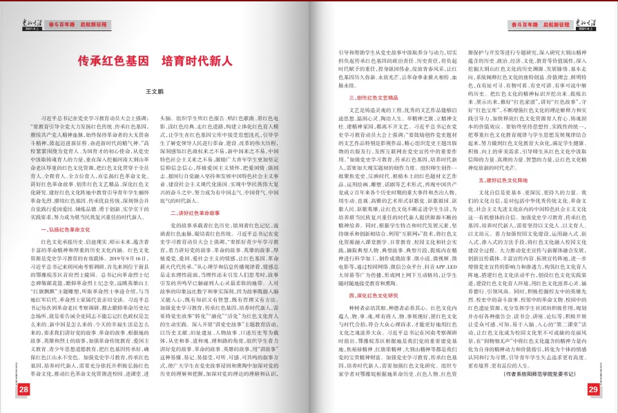 编者按:党史学习教育开展以来,学校将党史学习教育与立德树人紧密结合起来,从党史中汲取铸魂育人的精神力量,深入挖掘大别山革命老区厚重的红色文化资源,在弘扬红色革命文化、讲好红色革命故事、创作红色文艺精品、深化红色文化研究、建好红色文化阵地中教育引导青年学生传承红色基因,成长为堪当民族复兴重任的时代新人。校党委书记王文鹏在《党的生活》第6期以《传承红色基因 培育时代新人》为题对金年会官网党史学习教育的育人成效进行了专题报道。