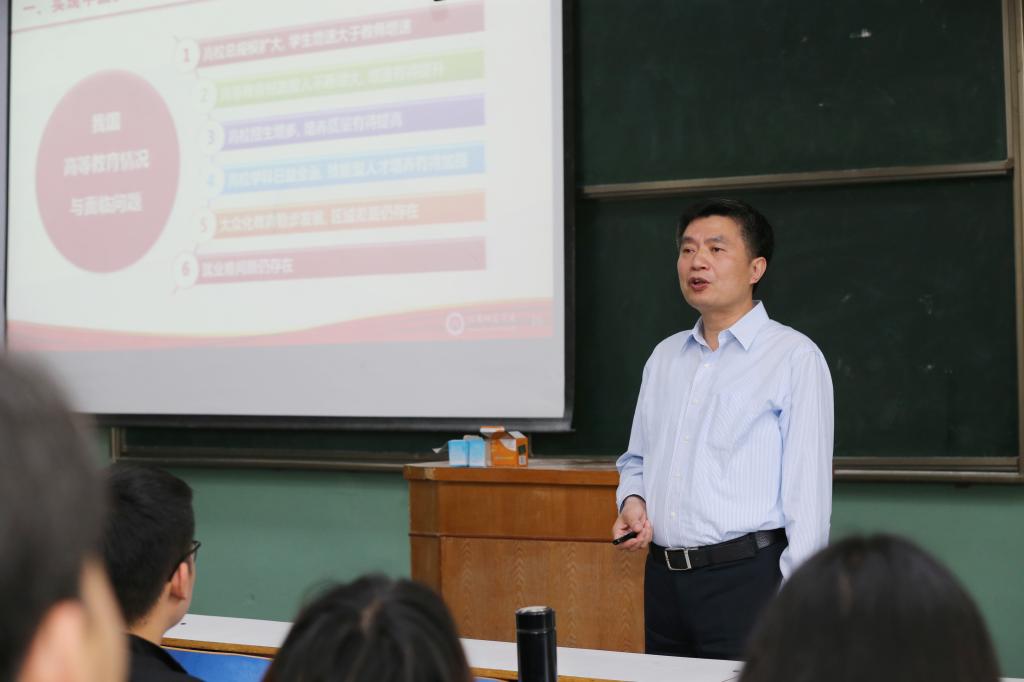 余本海紧扣全面贯彻党的教育方针和习近平总书记在全国教育大会上的重要讲话精神,从实现中国梦归根到底靠人才教育和好老师是民族的希望两个方面进行了讲授。余本海指出,立德树人是高校的立身之本,立德树人的成效是检验学校一切工作的根本标准,真正做到以文化人、以德育人,不断提高学生思想水平、政治觉悟、道德品质、文化素养,做到明大德、守公法、严私德;马克思主义是我国高校鲜亮的底色,是我们立党立国的根本指导思想,也是我国大学最鲜亮的底色;教育强则国家强,高等教育发展水平是一个国家发展水平和发展潜力的重要标志,扎根中国大地办大学,办中国特色的一流大学。教师是立教之本,兴教之源,兴国必先强师;做党和人民满意的好老师,就是要做有理想信念、有道德情操、有扎实学识、有仁爱之心的“四有”好老师,为国家富强、民族振兴、人民幸福培养更多更好的优秀人才。课程最后,余本海以李芳老师的事迹和曲建武、程艺、刘梅生、焦素娥等优秀教师实例勉励课堂学子找准目标、立足长远、努力奋斗,向榜样学习。