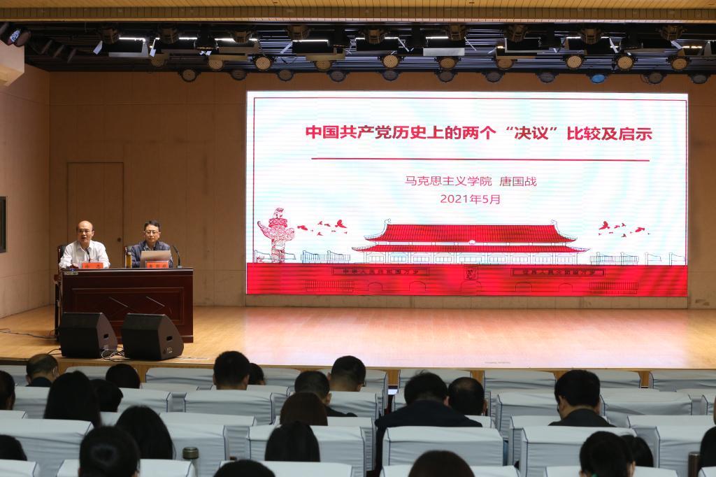 为推进机关部门党史学习教育走深走心走实,5月13日,机关党委邀请学校党史学习教育宣讲团成员、马克思主义学院党委书记唐国战教授,在理科楼报告厅作了题为《中国共产党历史上的两次“决议”比较及启示》的辅导报告。机关29个部门的科级干部及教职工代表参加学习。报告会由机关党委副书记徐忠主持。